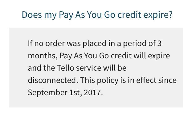 "Pay As You Go credit is available for a period of 3 months since customer's last order. If no order was placed in a period of 3 months, Pay As You Go credit will expire and the Tello service will be disconnected. This policy is effective since September 10, 2019."